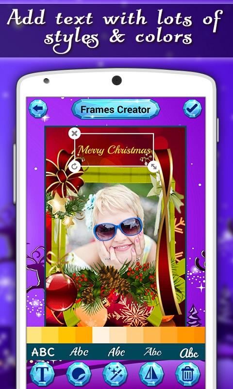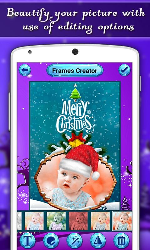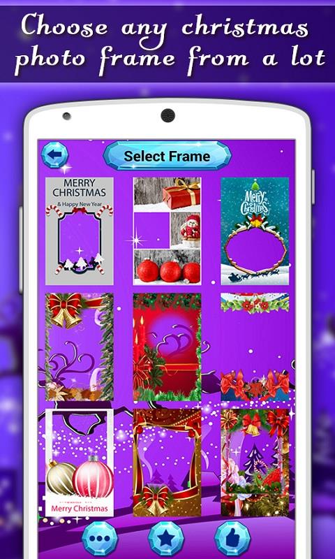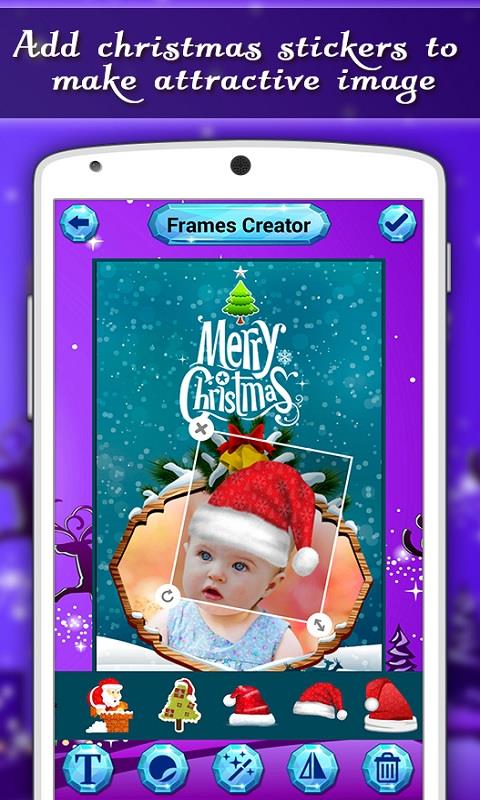 Christmas is the most wonderful time of the year. Celebrate the wonders of Christmas with "Christmas Frames". With this app, you can personalize your photo with free Christmas picture frames. Select a photo from your phone gallery or take a photo by using the camera and decorate it with exciting photo frames. Here we included the tons of different frames for you, like Santa clause, ice castle, snowman, Christmas tree and many others. You can also rotate and crop images to fit the frame. Then add text and select your favorite sticker. After that apply special like gray scale, clear effect, sepia and color effect on your photo. At the end save those beautifully decorated pictures on your phone and shares them on social networks like Facebook, Flickr, Twitter, WhatsApp, Instagram, etc.